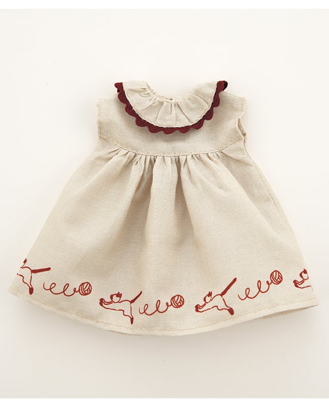 ワンピースの裾には、毛糸だまを追いかける子猫。