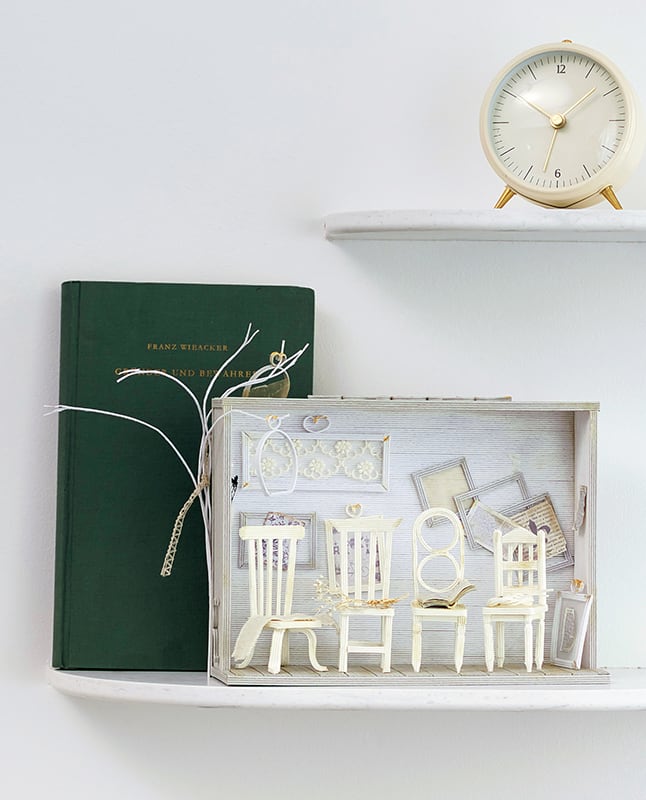 厚紙に紙バンドを貼って箱型に組み立て、真っ白な椅子を並べました。ビンテージ家具を扱う、パリの家具屋の雰囲気を漂わせるシーンを表現しています。
