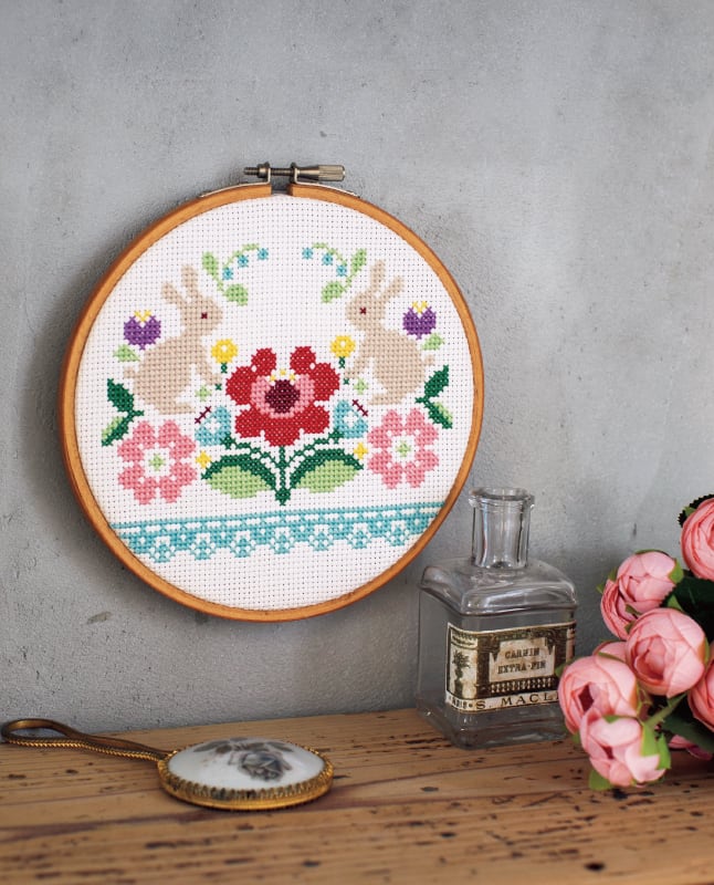 《うさぎと花のカロチャ風フレーム》書籍「刺しゅうの時間 vol.2」19ページに掲載