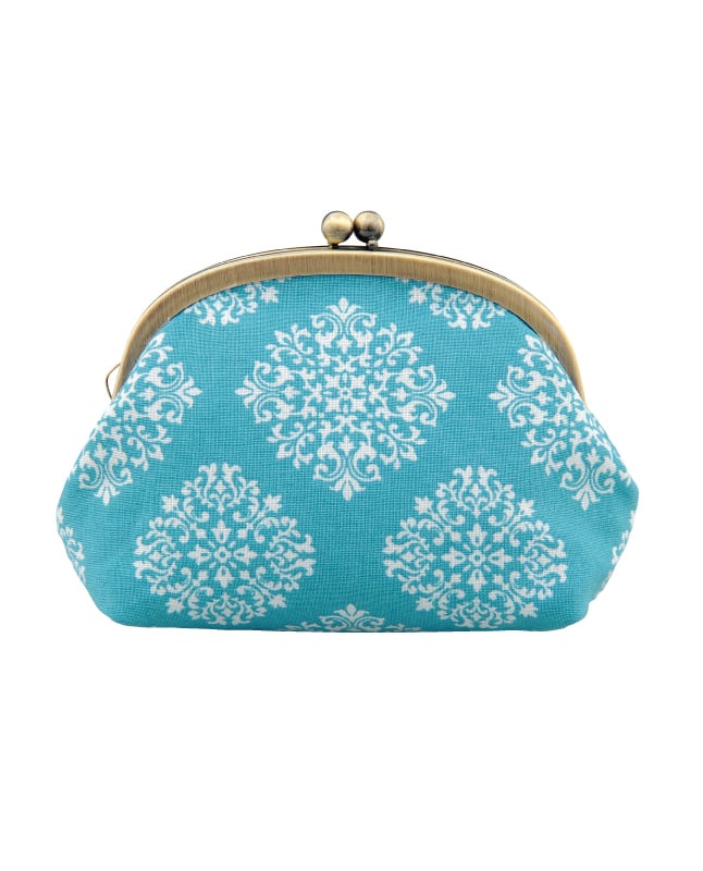 ブルー地にタイル柄が爽やかながまぐちポーチ