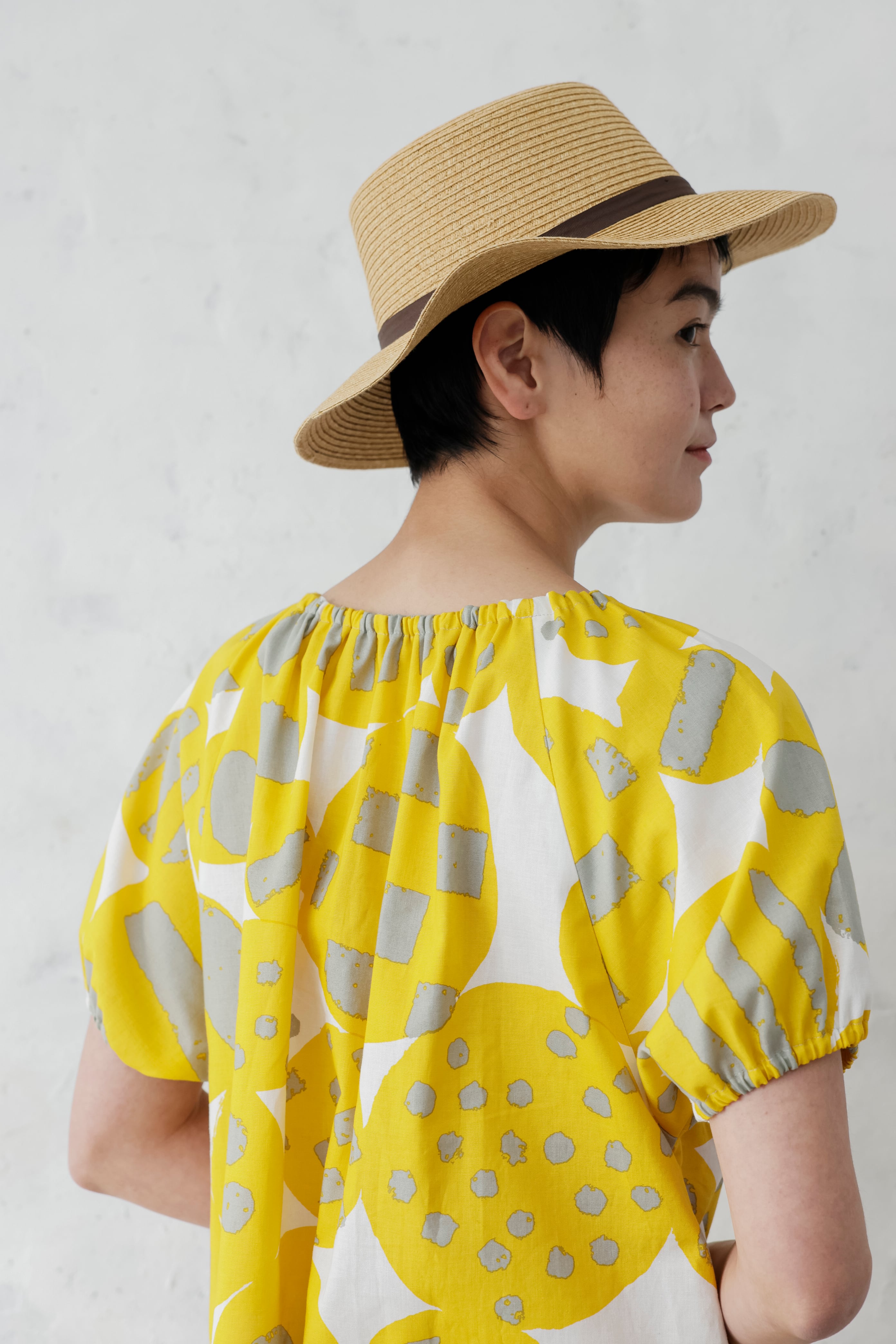 軽い、動きやすい、涼しいなど、魅力たっぷりなワンピース。面倒な袖付けの無いフレンチスリーブですが、後ろでラグラン切り替えにして女性らしいシルエットに。身体のラインを拾わないゆったりシルエットが魅力です。パンツをあわせていますが、もちろん一枚で着てもOK。