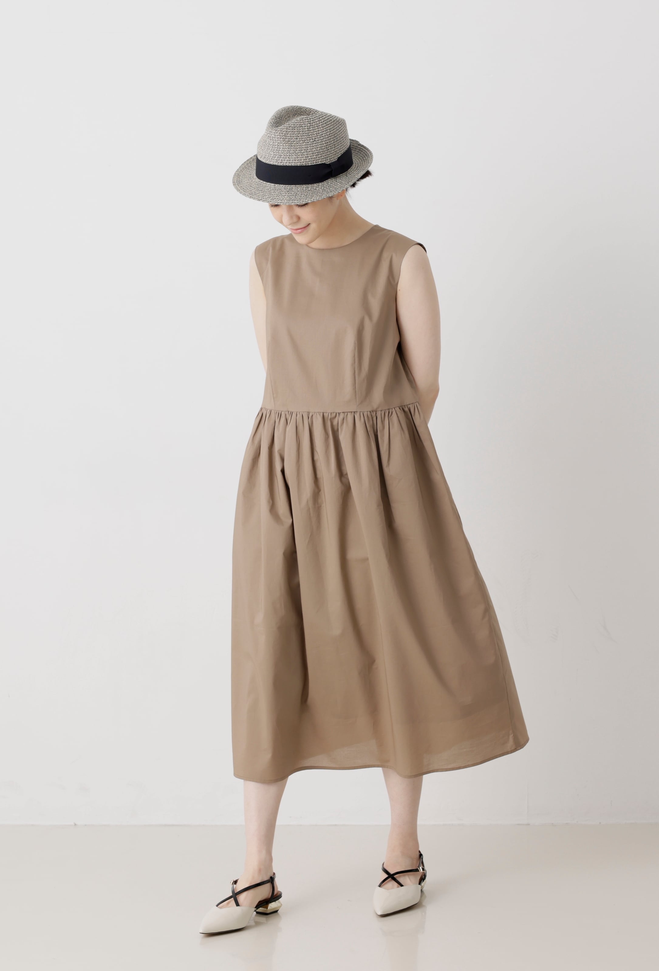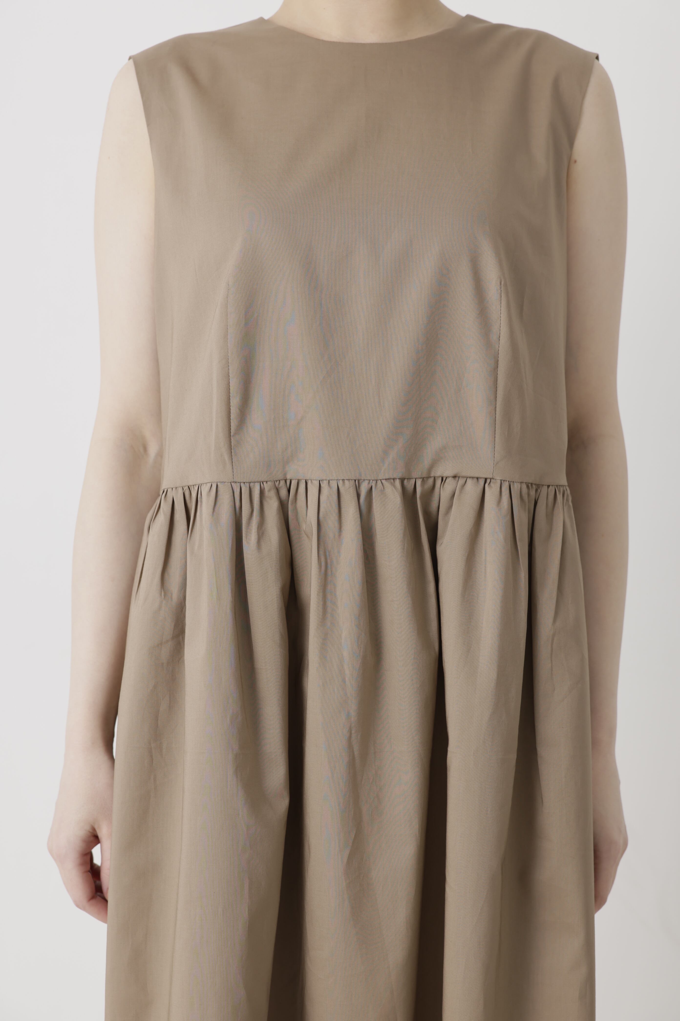 カーブが深すぎない、安心感のあるノースリーブワンピース。